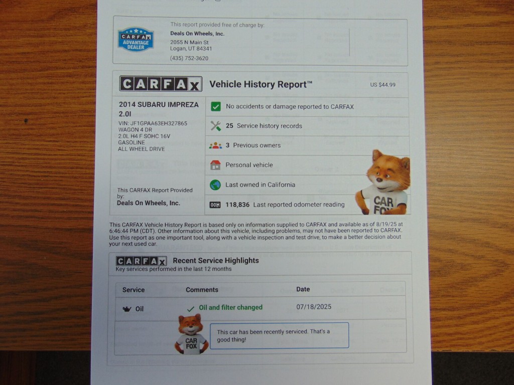2014 SUBARU IMPREZA WAGON, 2.0i, ALL WHEEL DRIVE, AUTOMATIC, 118,835 MILES, BLACK CLOTH INTERIOR, 5 PASSENGER SEATING, POWER WINDOWS, LOCKS, AND MIRRORS, TILT, CD PLAYER WITH STEERING WHEEL AUDIO CONTROLS, BLUETOOTH, USB/AUX PORT, UNIVERSAL GARAGE DOOR OPENER, COMPASS. NO CRUISE. CLEAN CARFAX WITH NO ACCIDENTS. CLEAN TITLE AND ACTUAL MILES. THIS SUBARU IS IN EXCELLENT CONDITION!