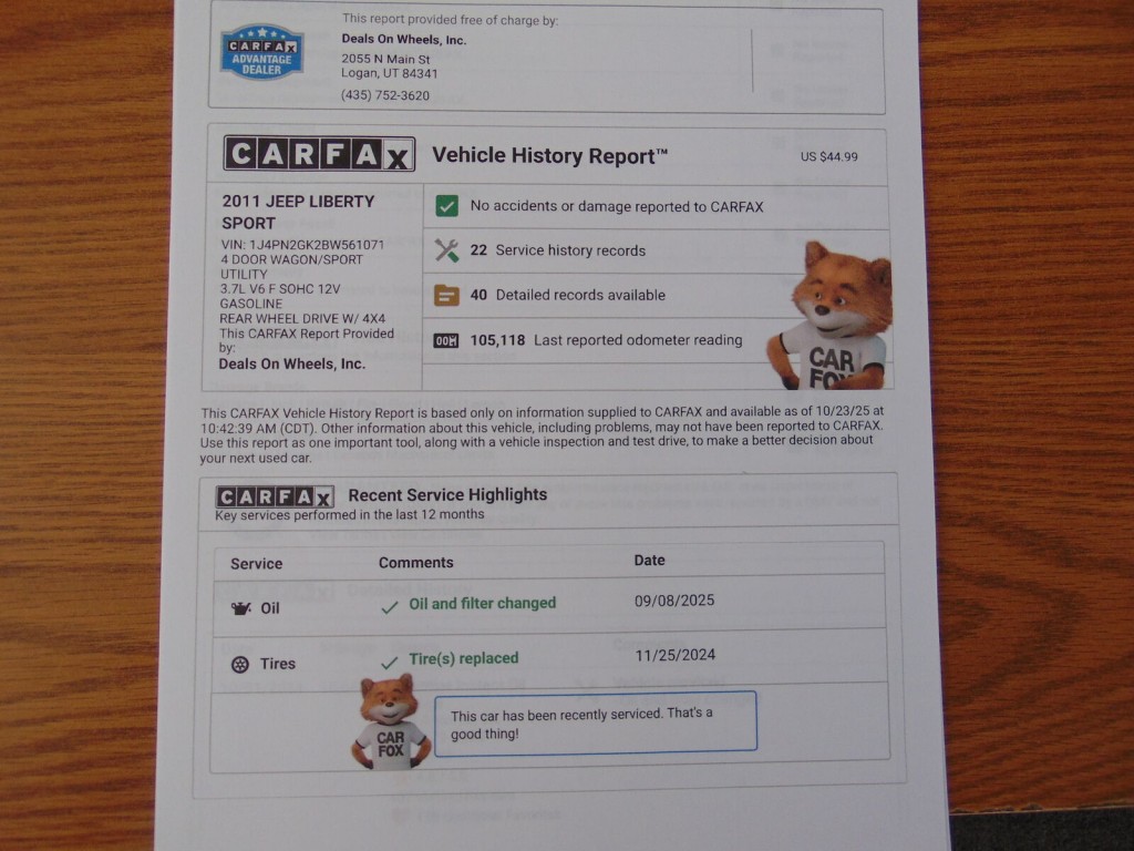 2011 JEEP LIBERTY, SPORT, 3.7L V6, 4X4, AUTOMATIC, 105,118 MILES, DARK GRAY CLOTH INTERIOR, 5 PASSENGER SEATING, POWER WINDOWS, LOCKS, AND MIRRORS, TILT, CRUISE, CD PLAYER WITH STEERING WHEEL AUDIO CONTROLS, XM RADIO, FACTORY ALLOY WHEELS, ROOF RACK, TOW PACKAGE. CLEAN CARFAX WITH NO ACCIDENTS AND 22 SERVICE RECORDS. CLEAN TITLE AND ACTUAL MILES. THIS JEEP IS IN EXCELLENT CONDITION!