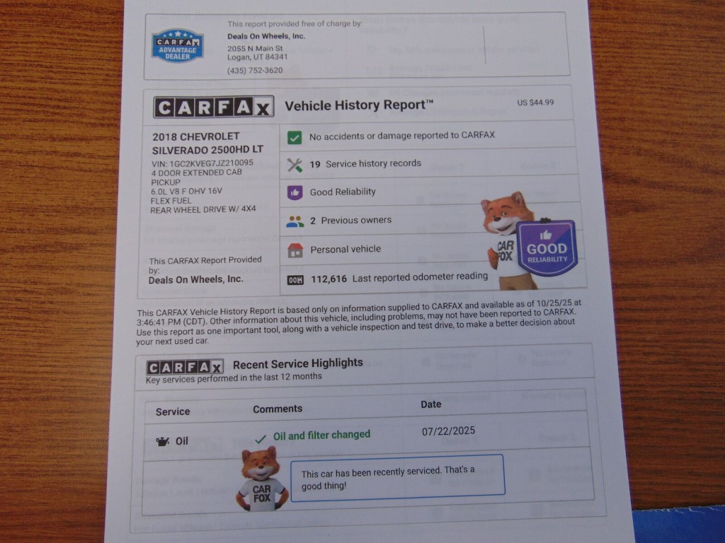 2018 CHEVY 2500HD, LT, EXTENDED CAB, LONG BED, 6.0L V8, 6L-90 AUTOMATIC, ELECTRIC SHIFT 4X4, 112,582 MILES, 4634 ENGINE HOURS, 4.10 AXLE RATIO WITH LIMITED SLIP, 9500 POUND GVW RATING, Z71 OFF ROAD PACKAGE, BLACK CLOTH INTERIOR, 6 PASSENGER SEATING, DRIVERS SIDE POWER SEAT WITH LUMBAR SUPPORT, POWER WINDOWS, LOCKS, AND MIRRORS, TILT, CRUISE, CD PLAYER WITH STEERING WHEEL CONTROLS, ONSTAR, 17 INCH FACTORY ALLOY WHEELS, REMOTE START, FACTORY TRAILER BRAKE CONTROLLER, USB/AUX PORT, BACKUP CAMERA, XM RADIO, FIXED RUNNING BOARDS, SPRAY IN BEDLINER, TONNEAU COVER, FOG LIGHTS, TOW MIRRORS, DUAL CLIMATE CONTROL, BLUETOOTH, REAR WINDOW DEFROSTER, 2 OWNERS AND NO ACCIDENTS WITH 19 SERVICE RECORDS. NON-SMOKER. NON-CANADIAN. CLEAN TITLE AND ACTUAL MILES. THIS CHEVY IS IN EXCELLENT CONDITION!