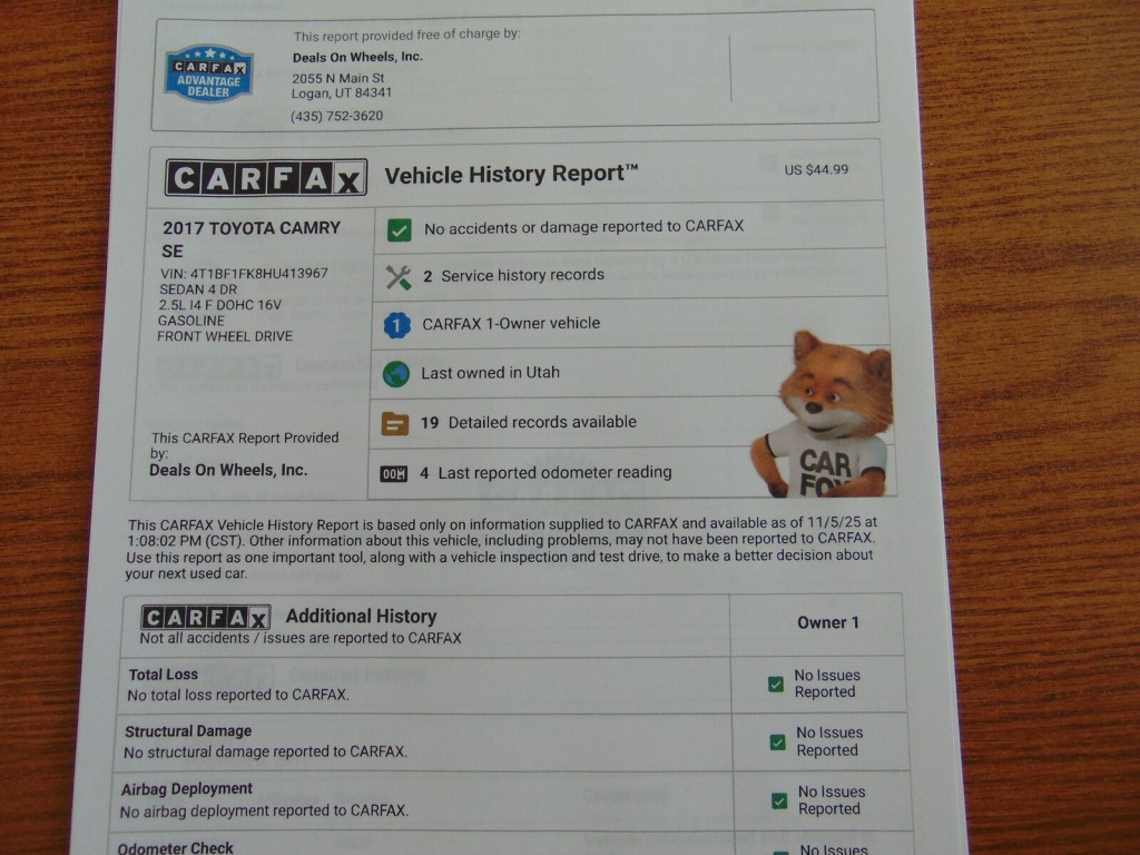 2017 TOYOTA CAMRY, SE, 2.5L 4CYL, AUTOMATIC, 84,696 MILES, MEDIUM GRAY CLOTH INTERIOR, DRIVERS SIDE POWER SEAT WITH LUMBAR SUPPORT, POWER WINDOWS, LOCKS, AND MIRRORS, TILT, CRUISE, CD PLAYER WITH STEERING WHEEL AUDIO CONTROLS, USB/AUX PORT, BLUETOOTH, BACKUP CAMERA, FACTORY ALLOY WHEELS. ONE OWNER WITH NO ACCIDENTS. CLEAN TITLE AND ACTUAL MILES. THIS TOYOTA IS IN EXCELLENT CONDITION!