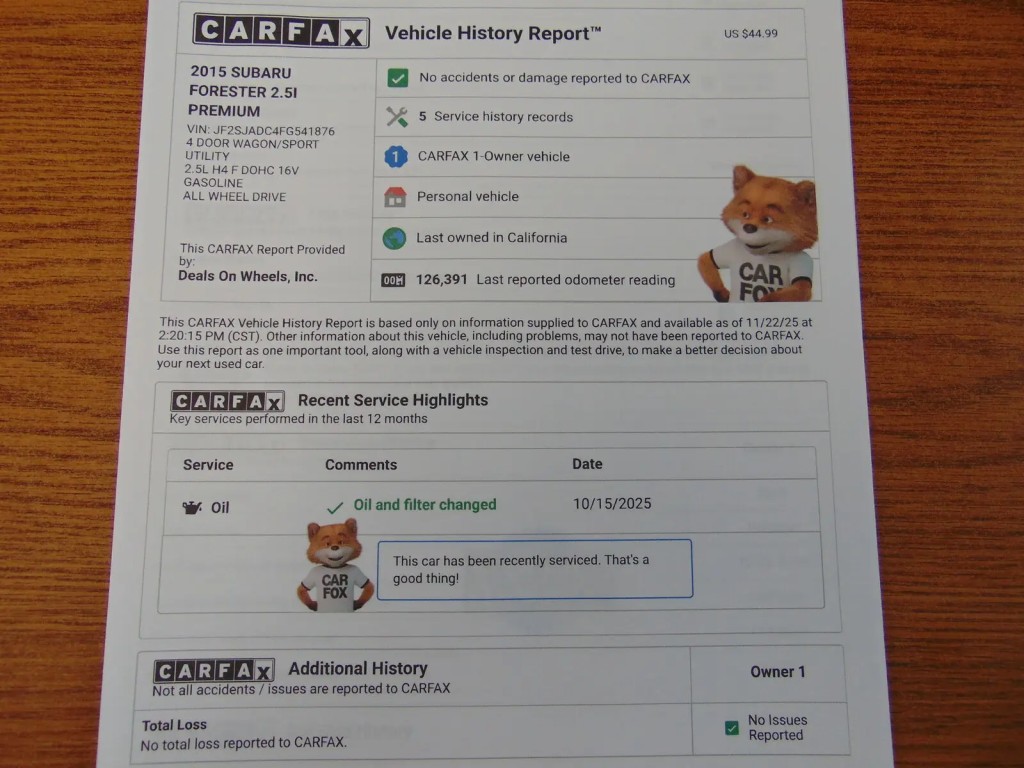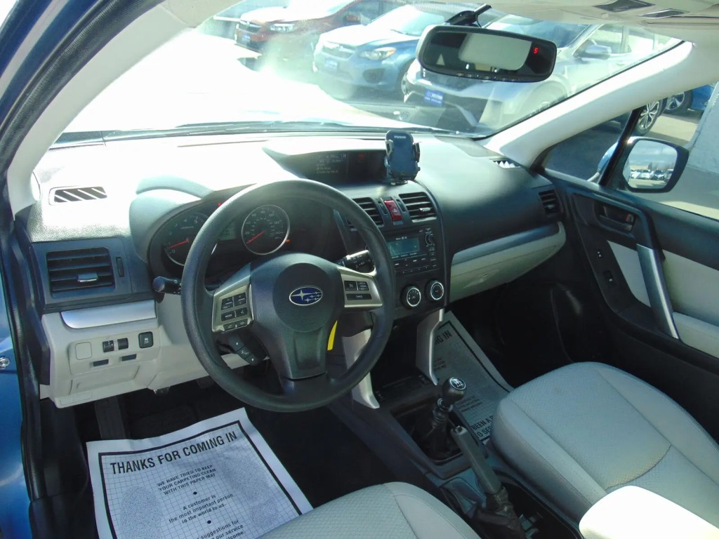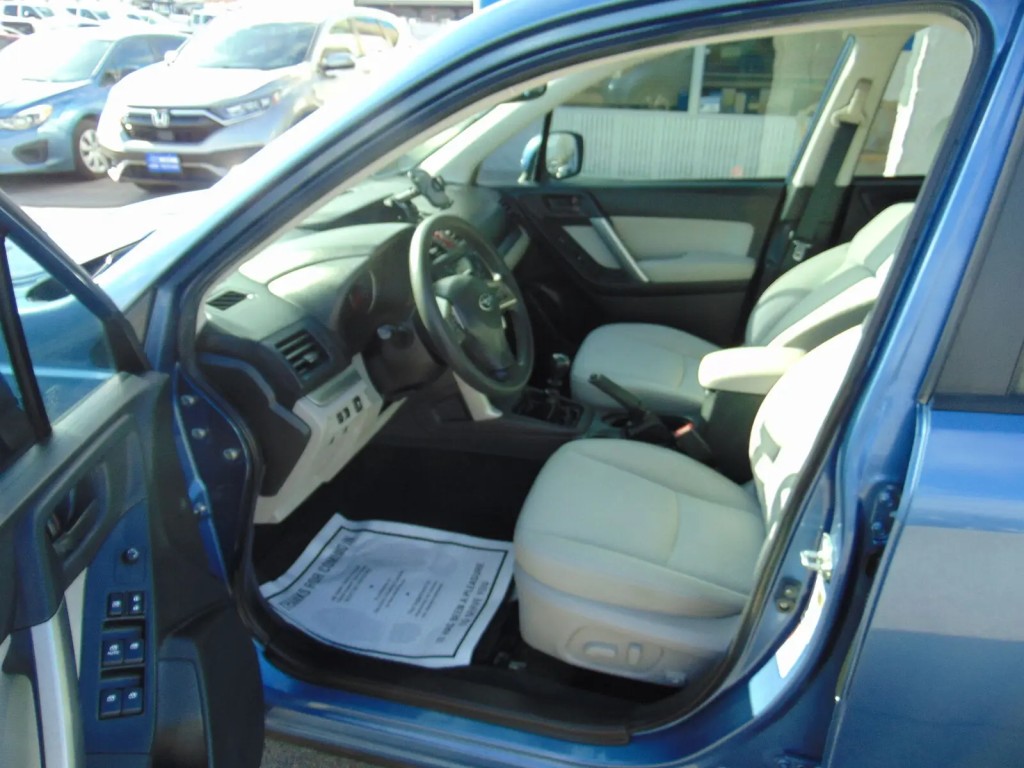 2015 SUBARU FORESTER, PREMIUM, 6 SPEED MANUAL, 2.5L 4CYL H4, ALL WHEEL DRIVE, 126,377 MILES, MEDIUM GRAY CLOTH INTERIOR, 5 PASSENGER SEATING, DRIVERS SIDE POWER SEAT WITH LUMBAR SUPPORT, POWER SUNROOF, HEATED SEATS, CD PLAYER WITH STEERING WHEEL CONTROLS, USB/AUX PORT, BACKUP CAMERA, UNIVERSAL GARAGE DOOR OPENER, COMPASS, AUTO DIMMING REAR VIEW MIRROR, BLUETOOTH, FACTORY ALLOY WHEELS, LUGGAGE RACK, TOW PACKAGE. ONE OWNER WITH NO ACCIDENTS FROM CALIFORNIA. CLEAN TITLE AND ACTUAL MILES. THIS SUBARU IS IN EXCELLENT CONDITION!