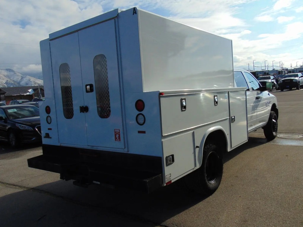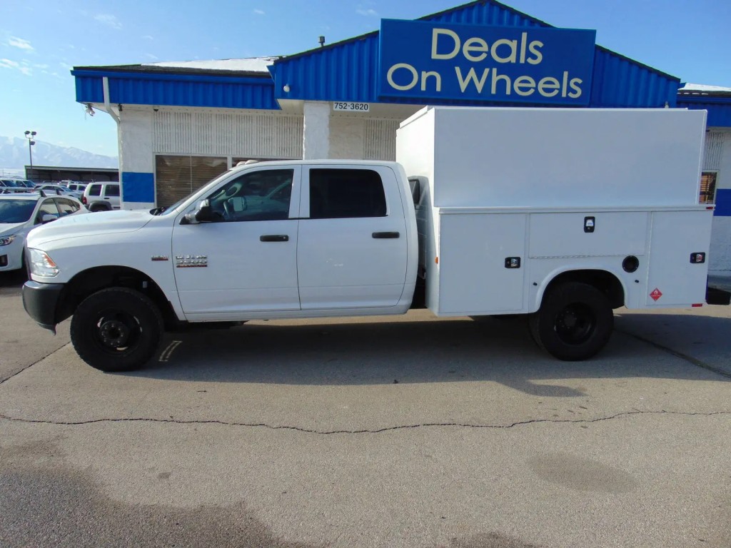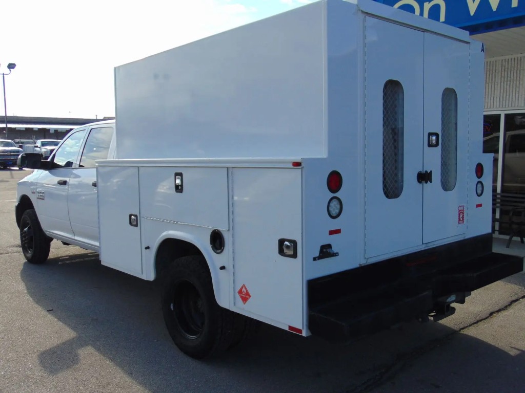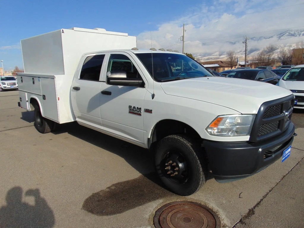 2017 RAM 3500 CHASSIS, TRADESMAN, UTILITY BOX, 6.4L V8, MANUAL SHIFT 4X4, 56,594 MILES, 681 ENGINE HOURS AND 426 IDLE HOURS, MEDIUM GRAY VINYL INTERIOR, 6 PASSENGER SEATING, 66RFE AUTOMATIC, TRANSMISSION, 172.4 INCH WHEELBASE, 4.10 AXLE RATIO WITH ANTI SPIN REAR DIFF, DUAL REAR WHEELS, 52 GALLON REAR FUEL TANK, POWER WINDOWS, LOCKS, AND MIRRORS, TILT, CRUISE, BLUETOOTH, FACTORY BRAKE CONTROLLER, TOW PACKAGE. CLEAN CARFAX WITH NO ACCIDENTS. CLEAN TITLE AND ACTUAL MILES. THIS RAM IS IN EXCELLENT CONDITION!