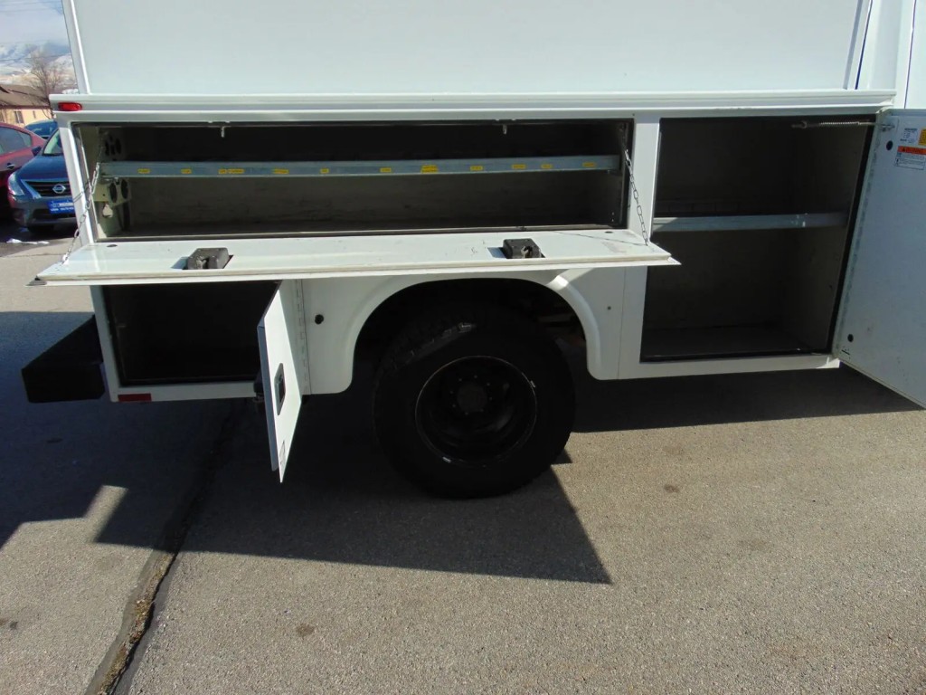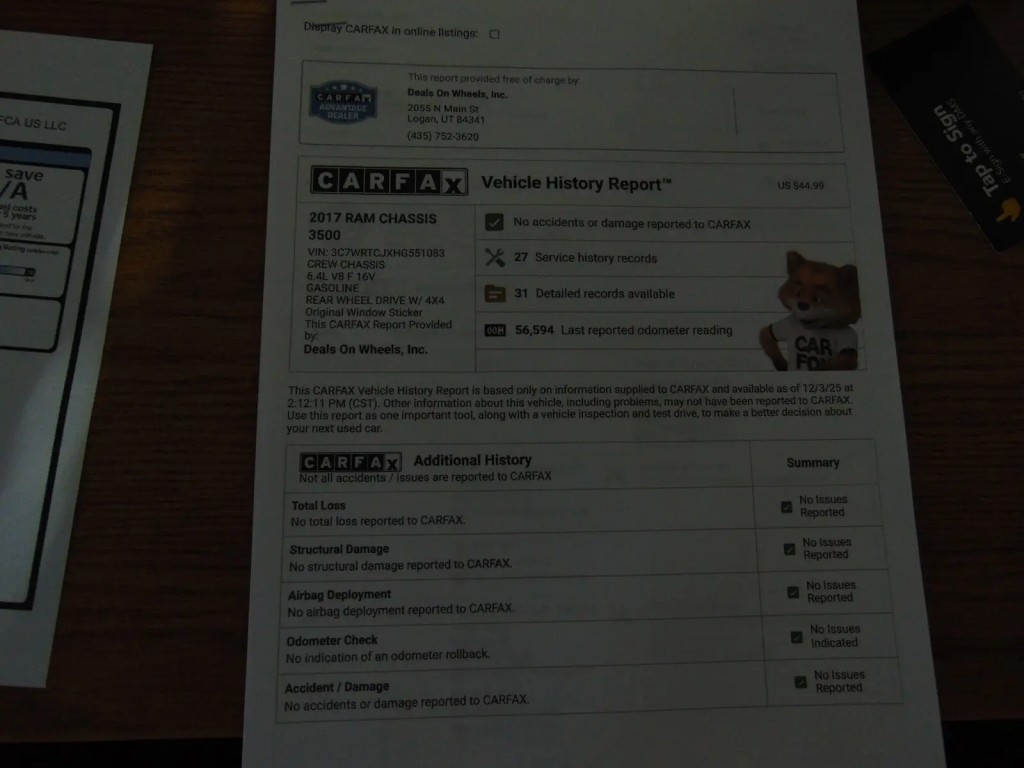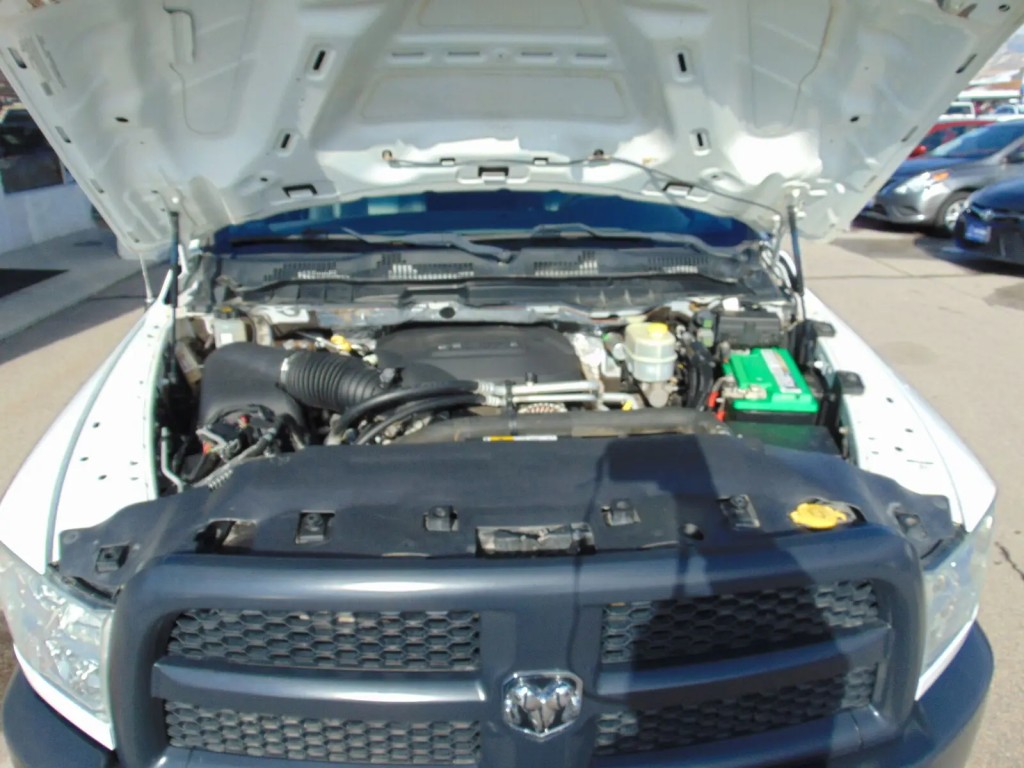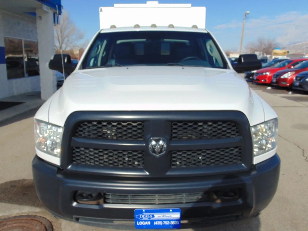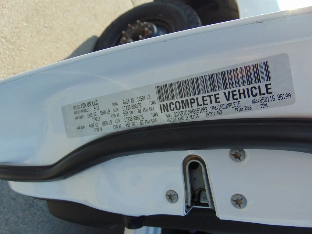 2017 RAM 3500 CHASSIS, TRADESMAN, UTILITY BOX, 6.4L V8, MANUAL SHIFT 4X4, 56,594 MILES, 681 ENGINE HOURS AND 426 IDLE HOURS, MEDIUM GRAY VINYL INTERIOR, 6 PASSENGER SEATING, 66RFE AUTOMATIC, TRANSMISSION, 172.4 INCH WHEELBASE, 4.10 AXLE RATIO WITH ANTI SPIN REAR DIFF, DUAL REAR WHEELS, 52 GALLON REAR FUEL TANK, POWER WINDOWS, LOCKS, AND MIRRORS, TILT, CRUISE, BLUETOOTH, FACTORY BRAKE CONTROLLER, TOW PACKAGE. CLEAN CARFAX WITH NO ACCIDENTS. CLEAN TITLE AND ACTUAL MILES. THIS RAM IS IN EXCELLENT CONDITION!